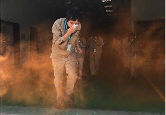 3、60人在員工分2組演習濃煙狀態下疏散,用布毛巾、紙巾等物品濕水捂住口鼻低姿從火場撤出。