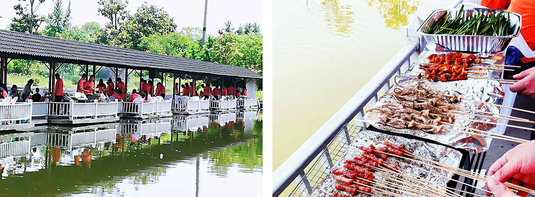 動力圈結束后就到了中午的燒烤時間,我們從草坪出發沿著營地湖邊走到了湖上的水上長廊,坐在涼風習習的水中亭廊上,各式各樣的燒烤食材齊齊擺上,公司里一個個隱藏的燒烤老師傅開始大顯身手,金黃的雞翅,油滋滋的五花肉,香噴噴的魷魚等一一出爐。同事們悠閑的坐在椅子上,吹著微風,吃著美味的食物,喝著爽口的飲料和酒,還有同事自制了工具用著烤好的食物去勾著湖里的小蝦。